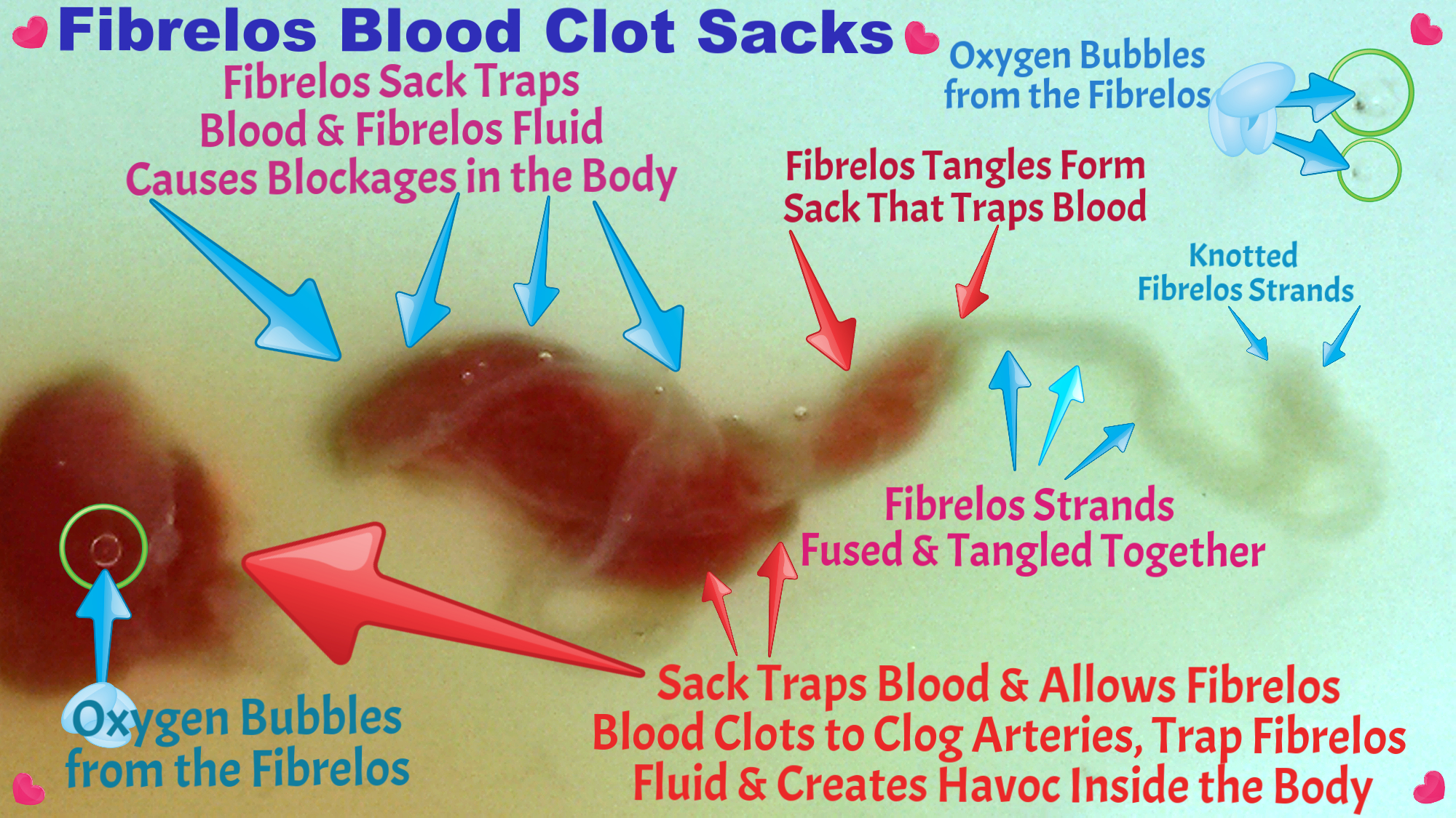 Fibrelos Strands fused together. This makes the clots hold together in a Fibrelos Blood Clot Sack, as mentioned above, it could potentially clog nearly every part of the body & blood systems. There's also a potential for stroke or a heart attack. Blood clots are a very special study portion of the Fibrelos Study, and we look forward to providing more information once it becomes available.