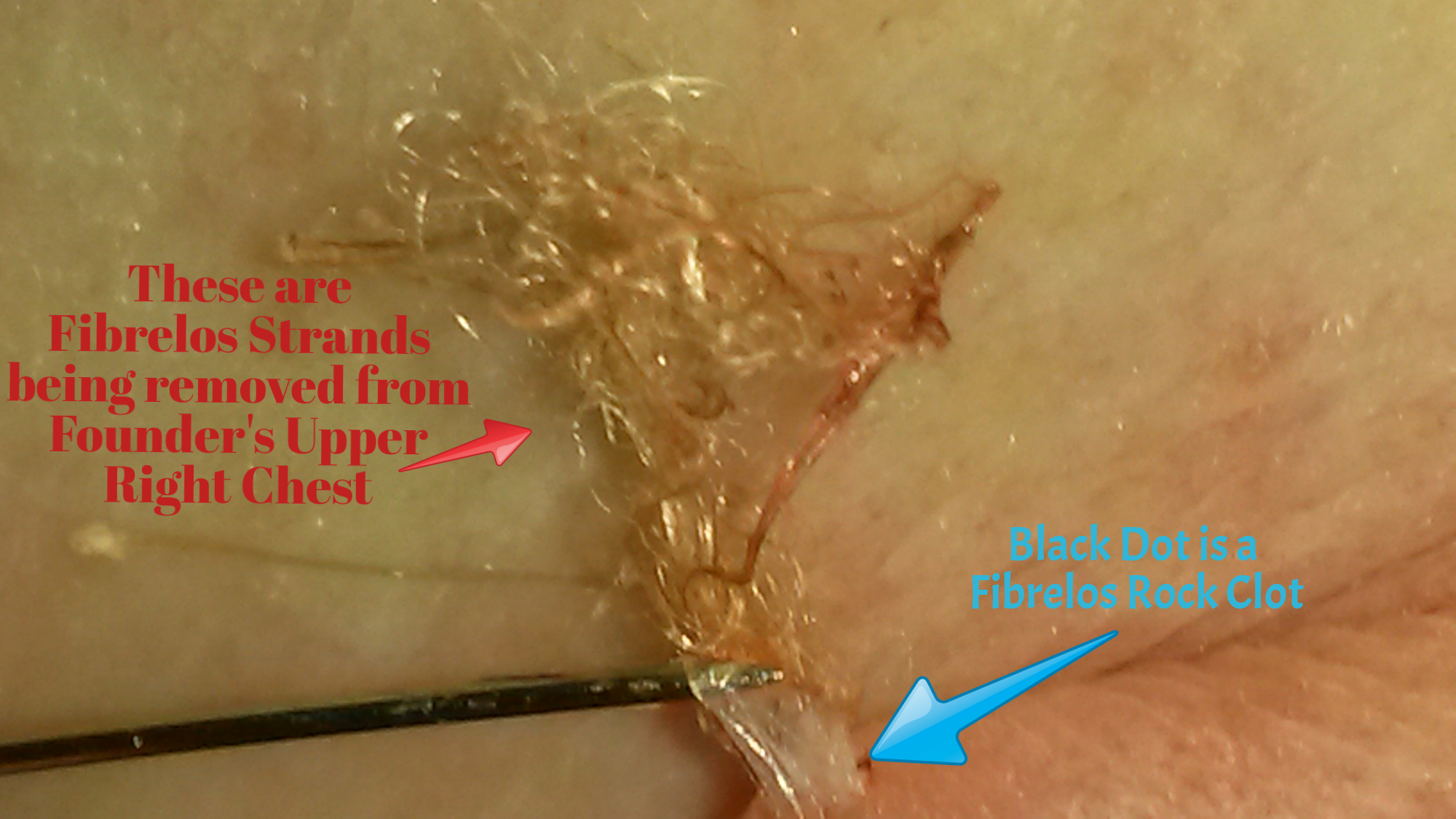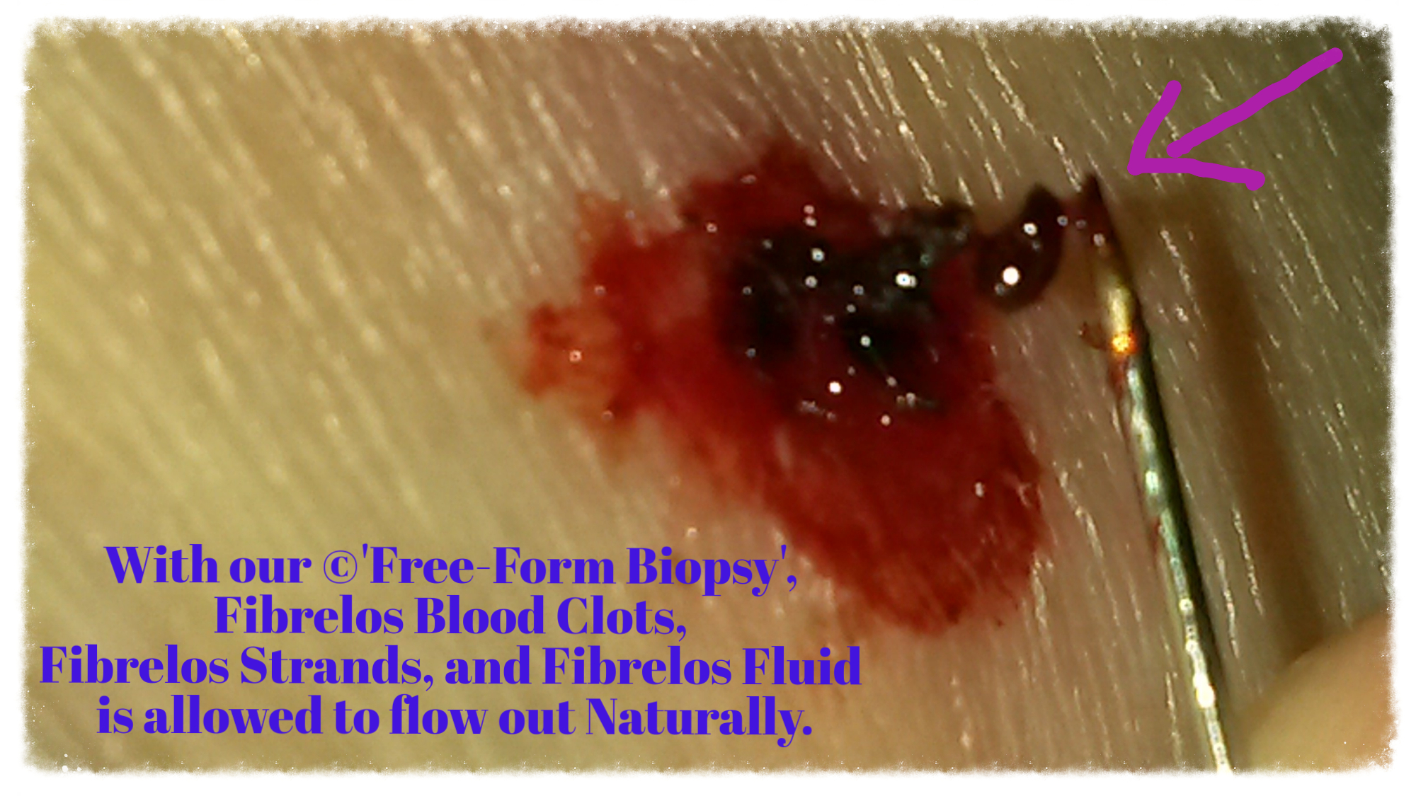 The ©Pin Prick Shunt & Natural Flow Biopsy, the Fibrelos Strands, plus Fibrelos blood clots, Fibrelos Fluid, flows naturally. This is a natural shunt- the ©Pin Prick Shunt assists with fluid drain specimen flow out. This Patient is still having Lumps, Bumps, and Symptoms of Fibrelos.